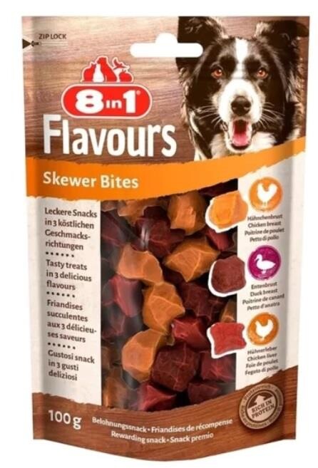 8in1 Flavours Skewer Bites, tavuk göğsü, ördek göğsü ve tavuk ciğeri olmak üzere üç farklı tada sahip, et lokmaları şeklinde hazırlanmış lezzetli ödüllerdir.