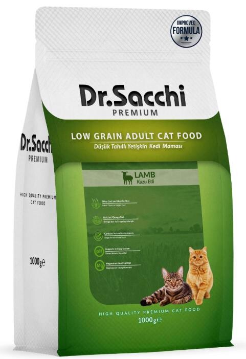 Dr.Sacchi Premium Düşük Tahıllı Kuzu Etli Yetişkin Kedi Maması, 1 yaş ve üzeri kedilerinizin beslenmesinde optimum düzeyde fayda sağlar. İçeriklerimizde kullanılan yoğun ve yüksek kaliteli hayvansal proteinler kedinizi tüm yaşam evrelerinde güçlü ve sağlıklı kılar. Yapay tatlandırıcı, koruyucu ve renklendirici içermez.