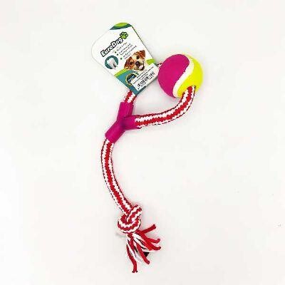 Gelince Haber VerKöpekler için, oyun oynarken diş temizliğine yardımcı olan, sıkıştırılmış pamuk ipliklerinden oluşan,tenis toplu diş ipi köpek oyuncağıdır.