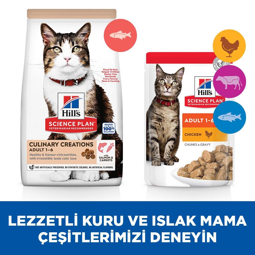 Gelince Haber VerHill's Science Plan CULINARY CREATIONS Somon ve Havuçlu yetişkin kedi maması, kedilere harika bir lezzet deneyimi sunmak için formüle edilmiştir. Lezzetli aroması ve kıvamı, kedileri yaşamlarının en güzel zamanlarında ideal sağlık açısından desteklemek için temel besinlerle bir araya getirilmiştir. Somondan elde edilen yüksek kaliteli protein, kalp sağlığı için gerekli taurinin yanı sıra böbrekleri ve mesaneyi desteklemek için dengeli minerallerle özel olarak formüle edilmiştir