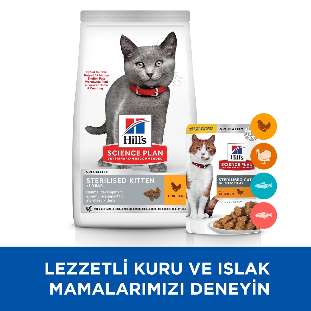 HILL'S SCIENCE PLAN Sterilized Kitten kedi maması, sterilize edilmiş yavru kedilerin optimal gelişimi ve bağışıklık desteği için lezzetli, eksiksiz ve dengeli beslenme sağlar, böylece hayata en iyi şekilde başlamalarını ve tam potansiyellerine ulaşmalarını sağlar.