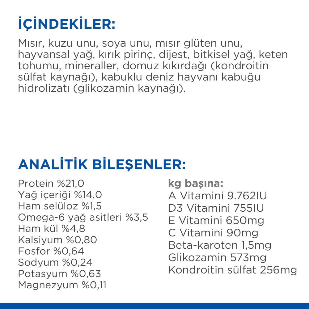 ANALİTİK BİLEŞENLER: Protein 21,8%, Yağ içeriği 14,5%, Ham lif 1,7%, Omega-3 Yağ asitleri 0,52%, Omega-6 Yağ Asitleri 3,39%, Ham kül 4,8%, Kalsiyum 0,76%, Fosfor 0,66%, Sodyum 0,24%, Potasyum 0,64%, Magnezyum 0,11%;her kg başına: Vitamin E 600 mg, Vitamin C 70 mg, Beta-karoten 1,5 mg, Glukozamin 412 mg, Kondroitin Sülfat 230 mg.