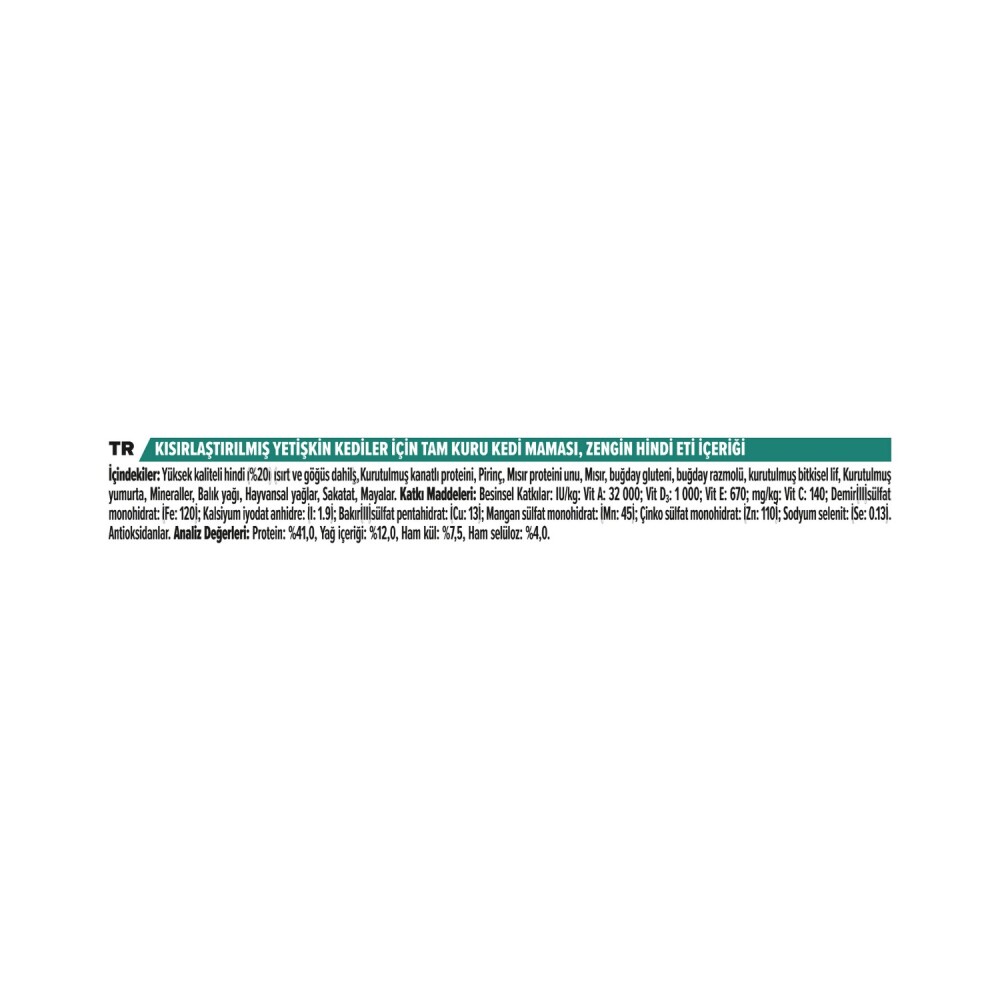 Kısırlaştırılmış yetişkin kediler için, özel olarak geliştirilmiş, azalan enerji ihtiyacına uygun olarak formüle edilmiş, yüksek sindirilebilirliğe sahip, hindi ve tavuklu kısırlaştırılmış kedi maması.