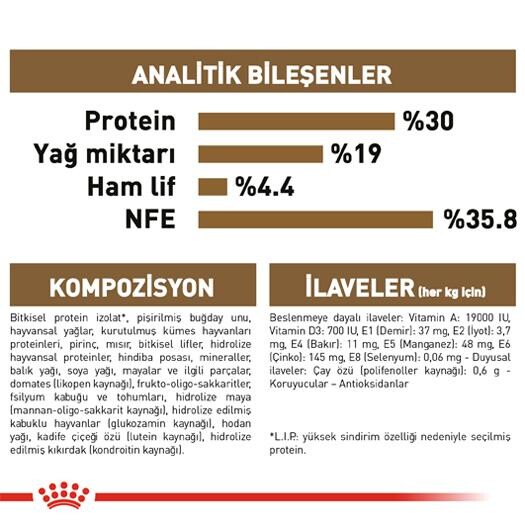 İçeriği: Mısır unu, darı, bitkisel protein * izole, kurutulmuş kümes hayvanları eti, hayvansal yağlar, darı gluten, hidrolize hayvansal proteinler, bitkisel lifler, hindiba posası, pirinç, soya yağı, mineraller, balık yağı, domates (likopen kaynağı), Psyllium kabukları ve çekirdekleri, frukto-oligo-sakkaritler, hidrolize maya (Manno-oligo-sakkaritler kaynağı), hidrolize edilmiş kabuklu hayvanlar (glukozamin kaynağı), hodan yağı, yeşil çay ve üzüm özleri (polifenoller kaynağı), kadife çiçeği özü (lutein kaynağı ), kıkırdak (kondroitin kaynağı), hidrolize.