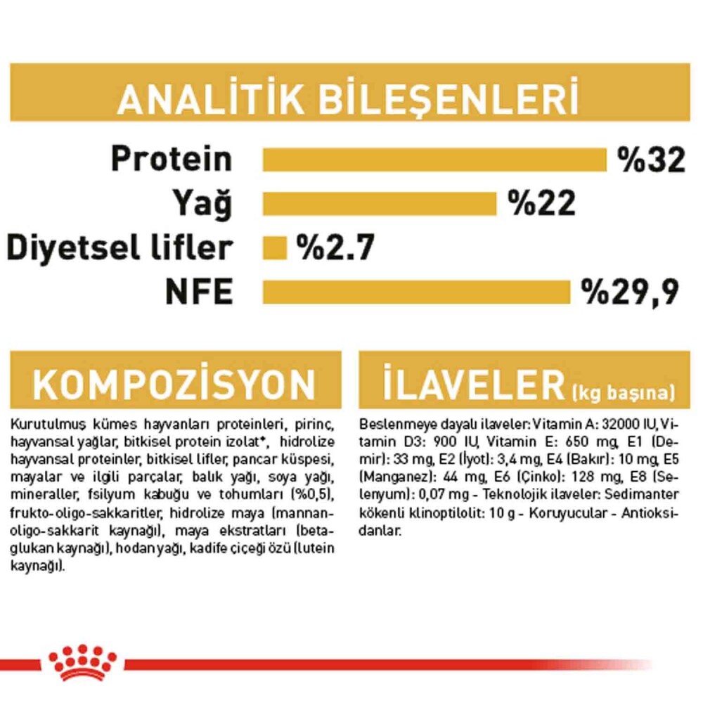 Kurutulmuş kümes hayvanları eti, pirinç, kümes hayvanları yağı, bitkisel lifler, mısır glüten, mısır unu, kurutulmuş kümes hayvanları karaciğeri, bitkisel yağlar (hodan yağı dahil), pancar küspesi, mineraller, yumurta tozu, balık yağı, fsilyum tohumu, frukto-oligo-sakkaritler, iz elementler (şelat iz elementleri içerir), L-lizin, DL-metiyonin, maya özü (mannan-oligo-sakkaritler den zengin), taurin, potasyum sitrat,vitaminler, çuha çiçeği özü (luteinden zengin).