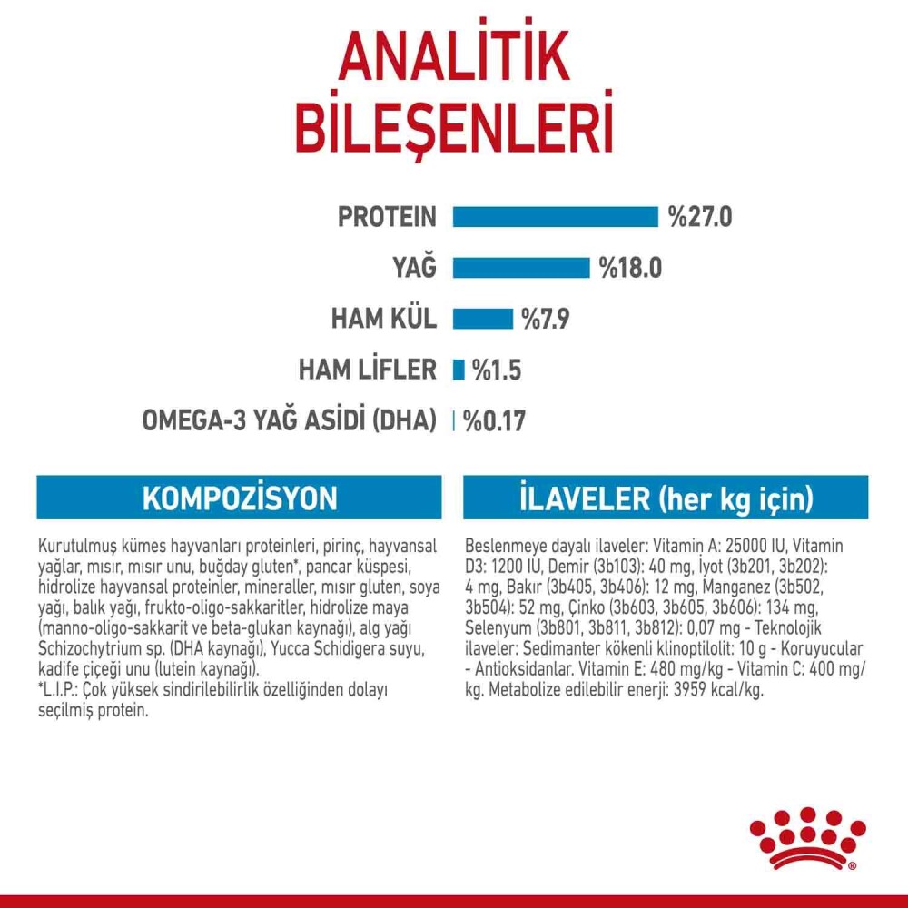 KOMPOZİSYON: Kurutulmuş kümes hayvanları proteinleri, pirinç, hayvansal yağlar, mısır, mısır unu, buğday gluten*, pancar küspesi, hidrolize hayvansal proteinler, mineraller, mısır gluten, soya yağı, balık yağı, frukto-oligo-sakkaritler, hidrolize maya (manno-oligo-sakkarit ve beta-glukan kaynağı), alg yağı Schizochytrium sp. (DHA kaynağı), Yucca Schidigera suyu, kadife çiçeği unu (lutein kaynağı).