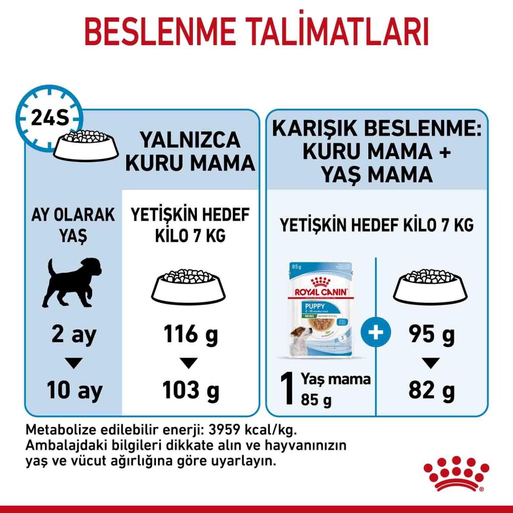 BESLENME TALİMATI: Tabloya bakınız. Parti kodu, tescil numarası ve son kullanma tarihi için, ambalajin üzerine bakınız. Serin ve kuru bir yerde saklayınız. Royal Canin Turkey Evcil Hayvan Ürünleri Ticaret Limited Şirketi tarafından ithal edilmiştir.