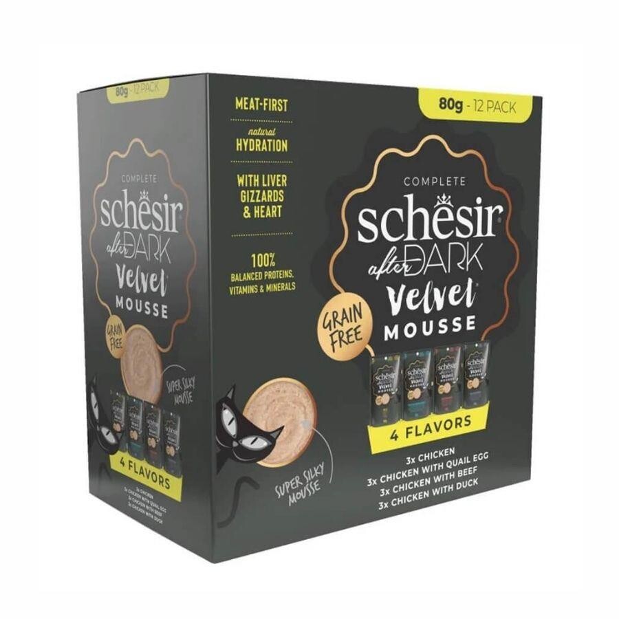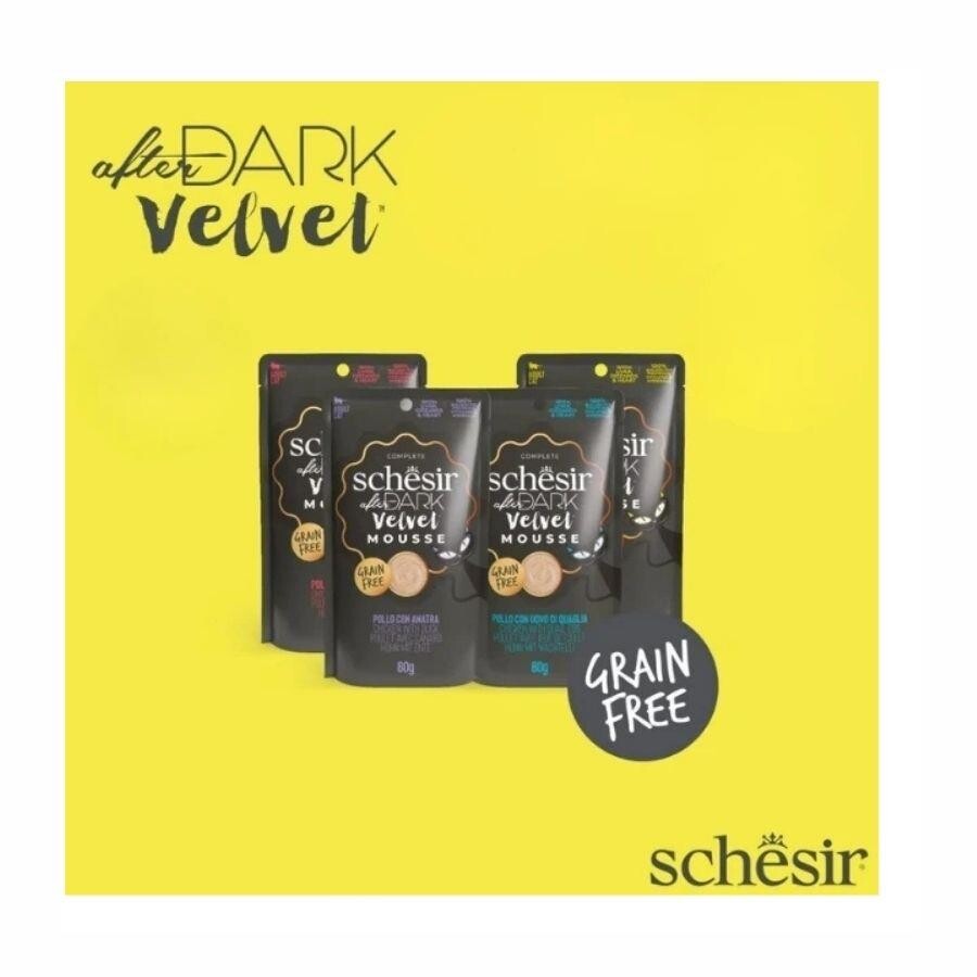 Schesir After Dark Velvet Mousse Çoklu Paket (12x80g), kedinizin damak zevkine hitap eden 4 farklı lezzet seçeneği sunar. Yüksek oranda et içeriği, taşlık, kalp ve karaciğer gibi doğal kaynaklarla zenginleştirilmiş tarifleri ile kedinizin doğal beslenme alışkanlıklarına uygundur. Tahılsız ve katkısız yapısı sayesinde hassas bünyeli kediler için de idealdir.