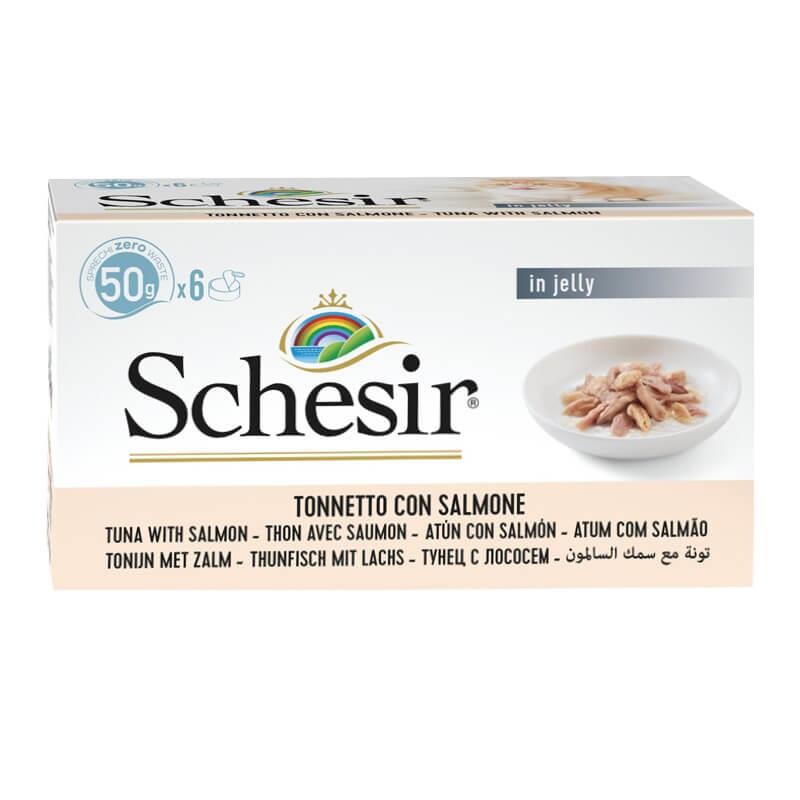 Schesir yaş mama paketi, 6 adet 50 gr'lık kedi konservesinin bulunduğu multipack ambalajdadır. Eşsiz lezzeti ile kedinizi cezbedecek olan Schesir yaş mama jöle içerisinde parça şeklinde somon ve ton balığı içermektedir. Kedinizin ihtiyaçlarını eksiksiz tamamlayacak kaliteli içeriğe sahiptir.