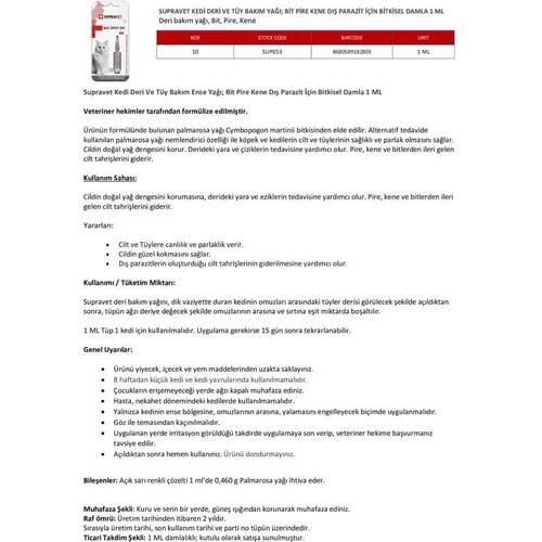 Dış parazitlerin oluşturduğu cilt tahrişlerinin giderilmesine yardımcı olur. Kullanımı / Tüketim Miktarı: Supravet deri bakım yağını, dik vaziyette duran kedinin omuzları arasındaki tüyler derisi görülecek şekilde açıldıktan sonra, tüpün ağzı deriye değecek şekilde omuzlarının arasına ve sırtına eşit miktarda boşaltılır. 1 ML Tüp 1 kedi için kullanılmalıdır. Uygulama gerekirse 15 gün sonra tekrarlanabilir. Genel Uyarılar: • Ürünü yiyecek, içecek ve yem maddelerinden uzakta saklayınız. • 8 haftadan küçük kedi ve kedi yavrularında kullanılmamalıdır. • Çocukların erişemeyeceği yerde ağzı kapalı muhafaza ediniz.