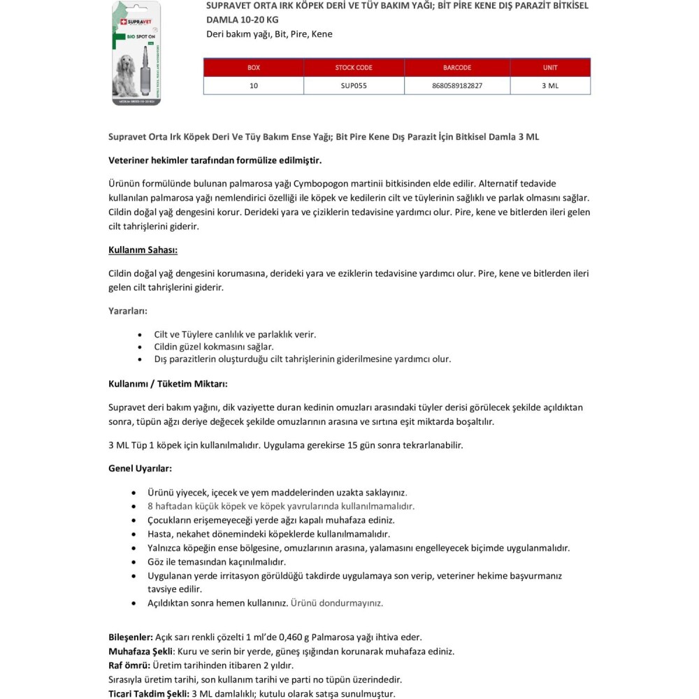Gelince Haber VerSupravet Orta Irk Köpek Deri Ve Tüy Bakım Ense Yağı; Bit Pire Kene Dış Parazit İçin Bitkisel Damla 3 ML