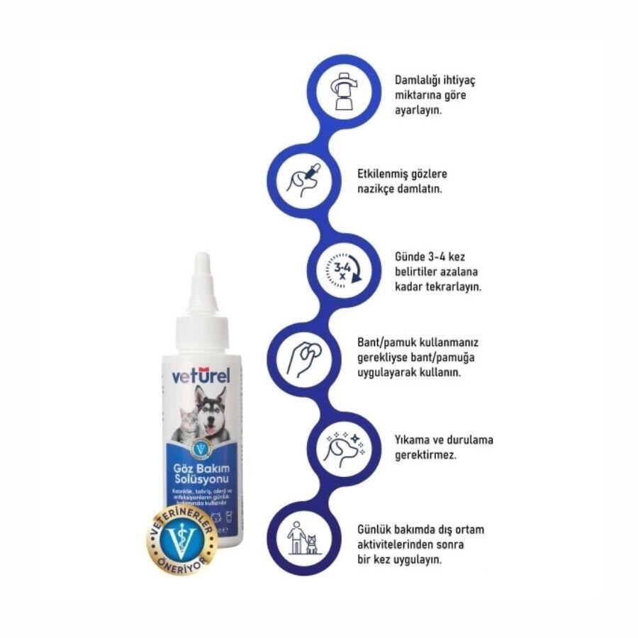 Veturel, her yaştaki evcil hayvan için güvenle kullanılabilen, doğal içerikli bir göz bakım solüsyonudur. Hipokloröz asit bazlı formülü sayesinde kaşıntı, tahriş, kızarıklık ve gözyaşı lekelerine karşı etkili temizlik ve bakım sunar.