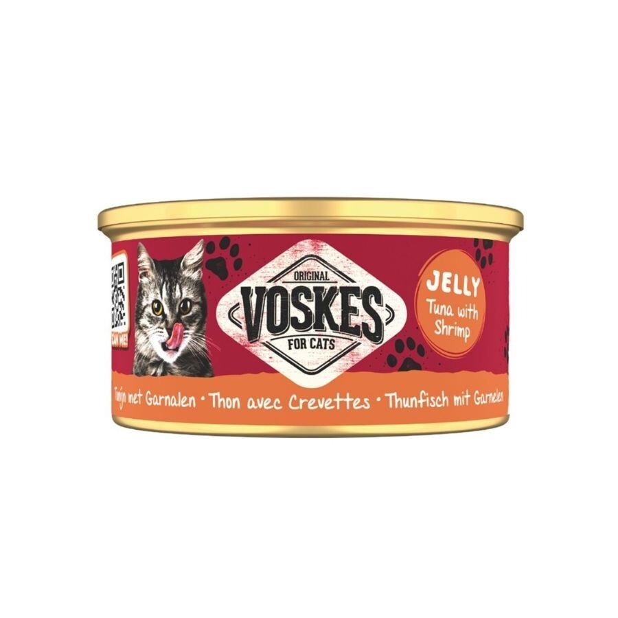 Voskes Ton Balığı ve Karidesli Kedi Konservesi, %51 ton balığı ve %6 karides içeriğiyle yetişkin kediler için hazırlanmış tamamlayıcı bir yaş mamadır.